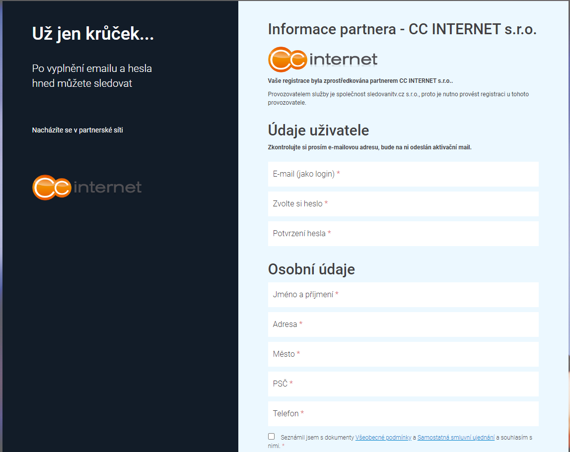 Je potřeba si vytvořit účet pro sledování Internetové televize na stránkách sledovanitv.cz. Při registraci je nutné, aby jste byli připojení na síti CC INTERNET (optimálně proveďte registraci přímo na místě, kde bude služba používána). Při vyplňování registračního formuláře použijte jméno a adresu té osoby, na kterou je psaná smlouva o připojení do sítě Internet. Po vyplnění formuláře (viz. níže) klikněte na tlačítko registrovat.